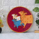 A beautiful pichwai artwork showcasing three cows in a perfect circle. The cows are adorned with intricate jewelry and stand on a wooden plate with a colorful floral border.